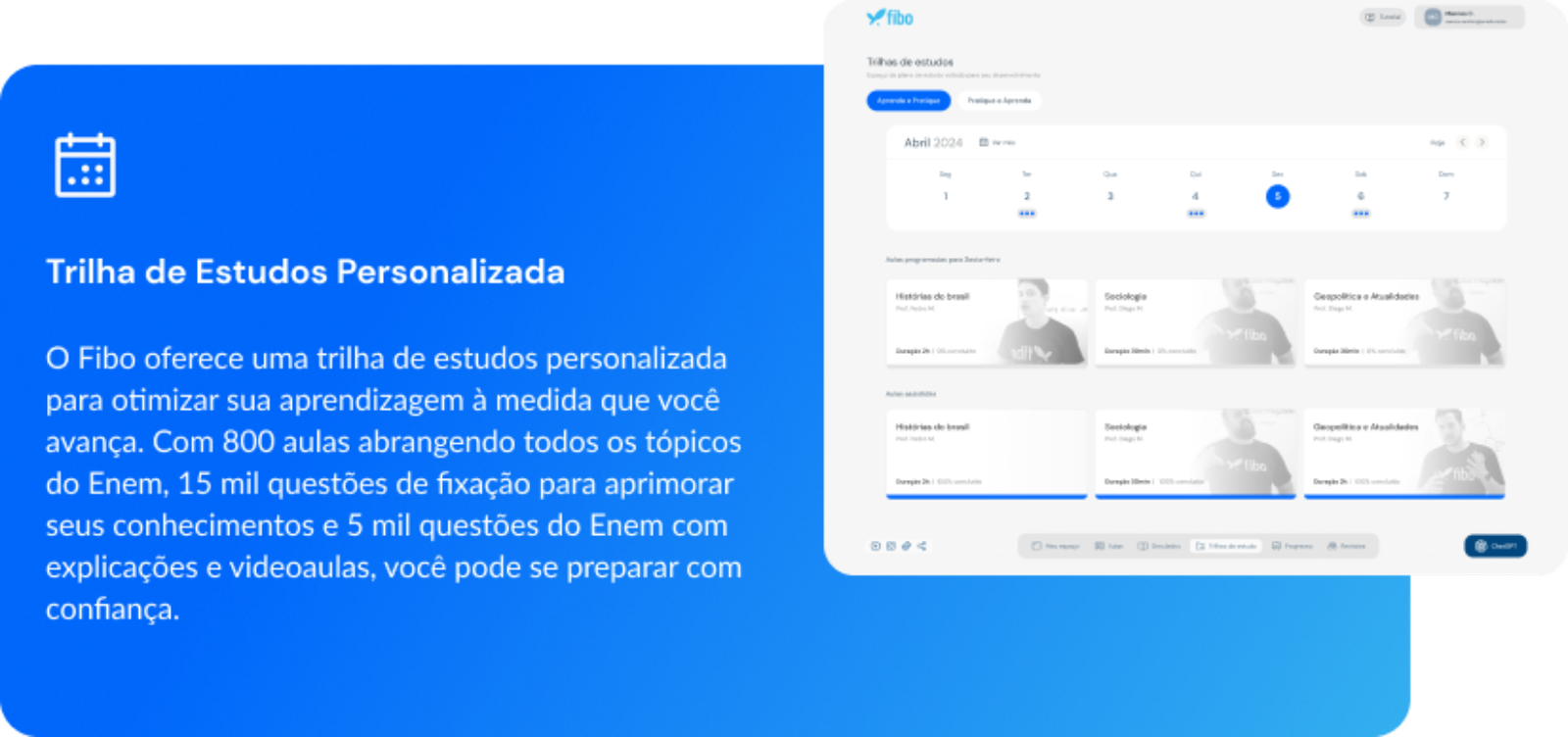 Chega de desespero! Combinando os estudos mais avançados da neurociência sobre aprendizagem e a tecnologia da inteligência artificial, o Fibo cria um plano de estudos personalizado para cada aluno, levando em consideração suas necessidades individuais, áreas de dificuldade e ritmo de estudo.